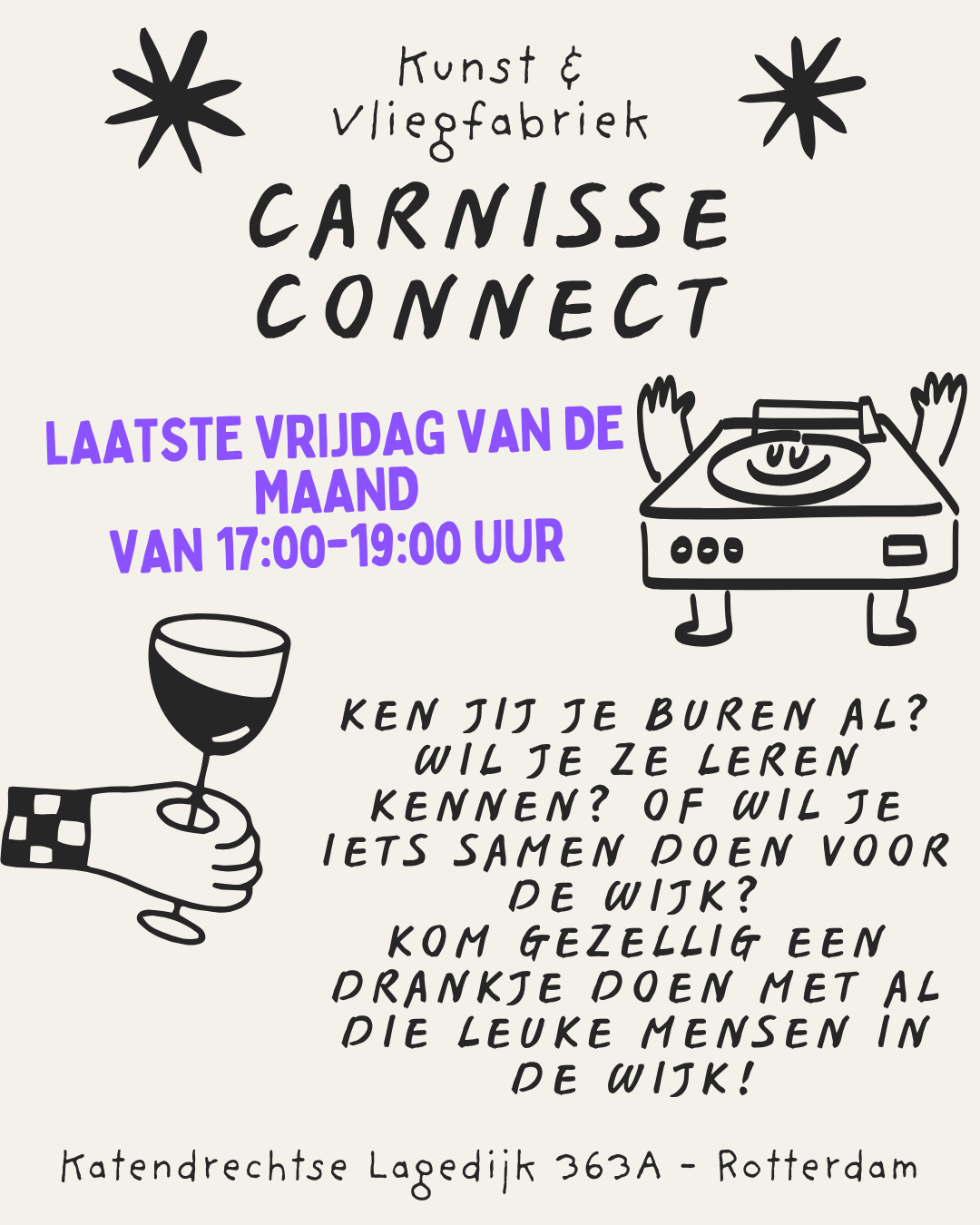 Ben jij een bewoner, initiatiefnemer of barst je van de creatieve ideeën en wil je daar wat mee? Kom naar de kerst editie van Carnisse Connect (let op, dit is op een zaterdag!) en vier nog een avondje kerst met ons. Wij zorgen voor een hapje en een drankje.